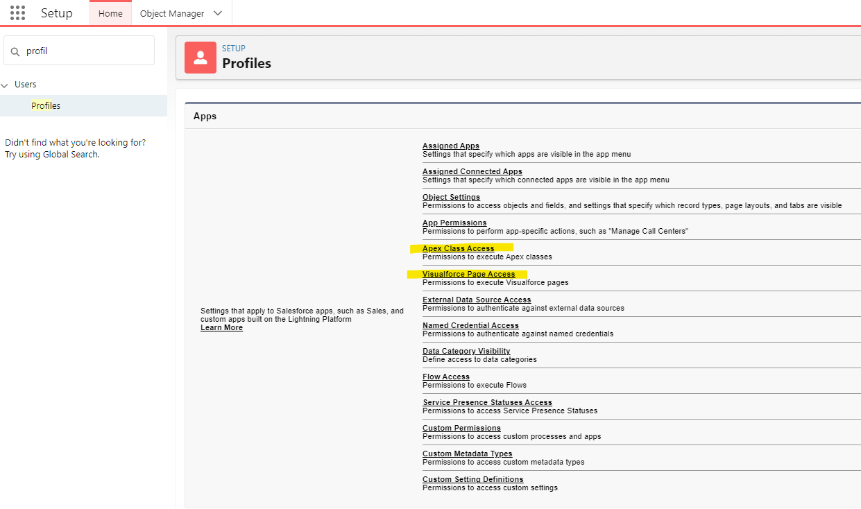 Settings > Profiles > Profile 선택 > Apex Class Access / Visualforce Page Access